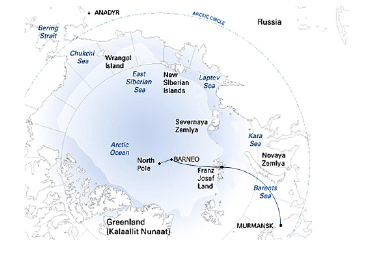 Das Barneo Ice Camp befindet sich auf einer treibenden Eisfläche, die sich langsam mit dem arktischen Eis über den 4 km tiefen arktischen Ozean bewegt. Trotz der extremen Eis- und Wetterbedingungen bietet das Barneo Ice Camp Besuchern beheizte Zelte und warme Mahlzeiten.