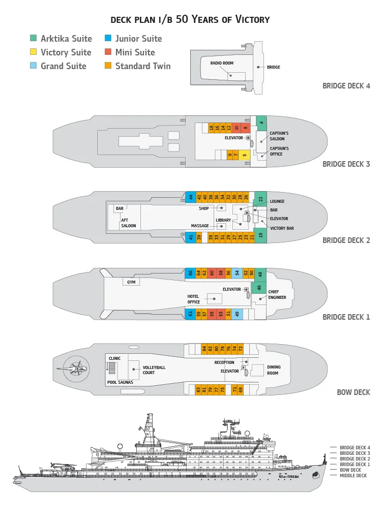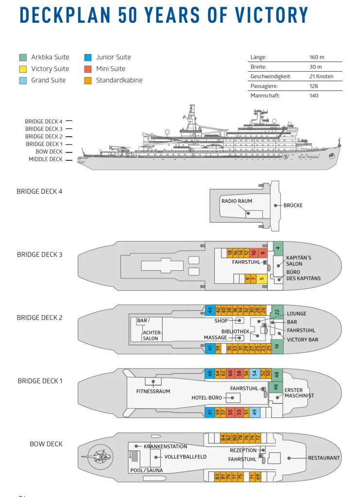 Die 50 YEARS OF VICTORY wurde im Jahr 2006 fertig gestellt und ist in jedem Fall kein typisches Touristenschiff. Der Eisbrecher wurde in Russland vielmehr mit dem Ziel gebaut, Forschungs- und Frachtschiffe durch die nur schwer erreichbaren Regionen der Arktis und entlang der Nordostpassage zu lotsen und ist dafür als einziges Schiff mit einer besonderen Bugform ausgestattet worden, die es ermöglicht, bis zu drei Meter dickes Eis zu durchbrechen. Nur während der kurzen Sommermonate bekommen Abenteurer die einmalige Gelegenheit, an Bord eines echten einsatzbereiten Eisbrechers zum geografischen Nordpol zu reisen und auf den Spuren berühmter Polarforscher zu wandeln. Im Schein der Mitternachtssonne, die hier vom 21. März bis zum 21. September nicht untergeht, bringt der Eisbrecher die Passagiere mit gewaltigen 75.000 PS immer weiter in Richtung Norden, während diese in einer der 64 komfortablen Kabinen untergebracht sind, ausgestattet mit Fenster und privater Dusche/WC .
