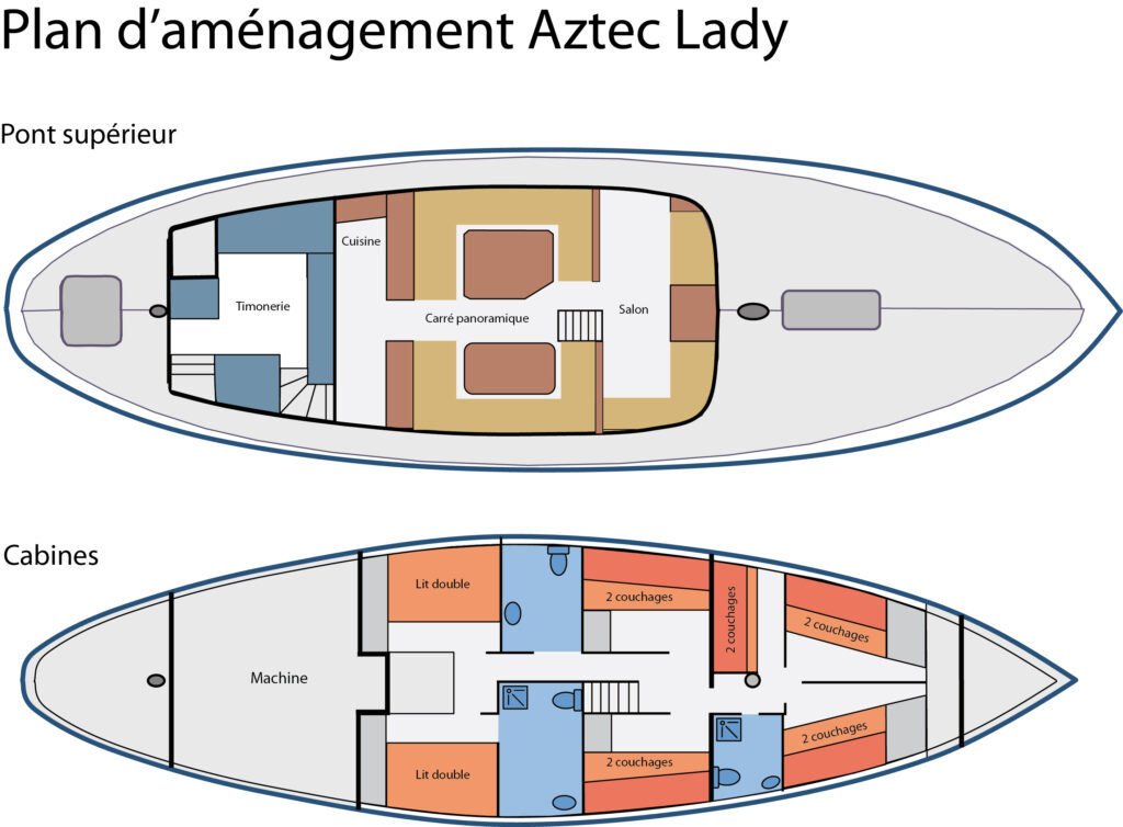 Die Anzahl der Passagiere ist auf 10 Personen begrenzt, um dieses Abenteuer in einer kleinen Gruppe so angenehm wie möglich zu erleben. An Bord spielt sich das Leben an Deck oder im Panorama-Salon ab, wo man einen wunderschönen Ausblick auf das Meer genießen kann. Zudem verfügt dieses Segelschiff über eine Zentralheizung, die für einen komfortablen und angenehmen Aufenthalt an Bord der AZTEC LADY bei allen Wetterbedingungen sorgt.