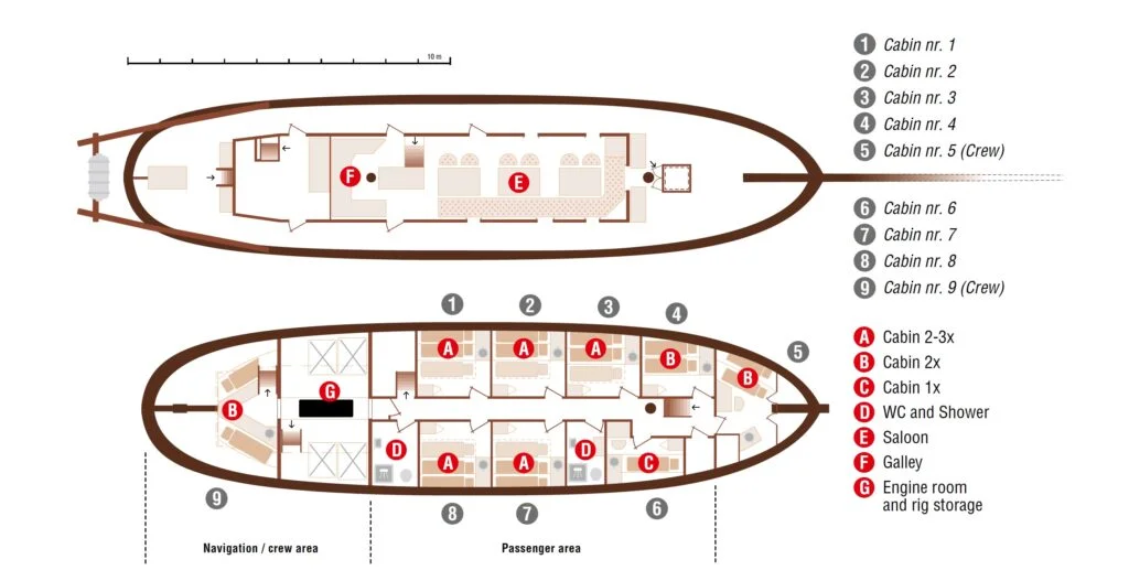 Die DONNA WOOD ist ein sehr geräumiges Schiff mit einem Decksalon und reichlich Platz unter Deck, wo zwölf Leute in sieben Kabinen komfortabel untergebracht werden können. Die Kabinen sind mit Waschbecken und WC ausgestattet und auf dem Korridor befinden sich geräumige Gemeinschaftsduschen so wie Toiletten.