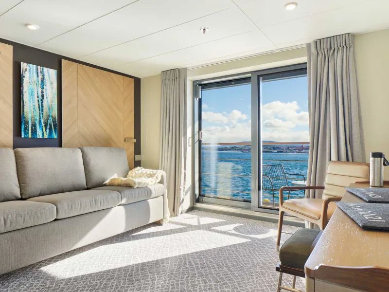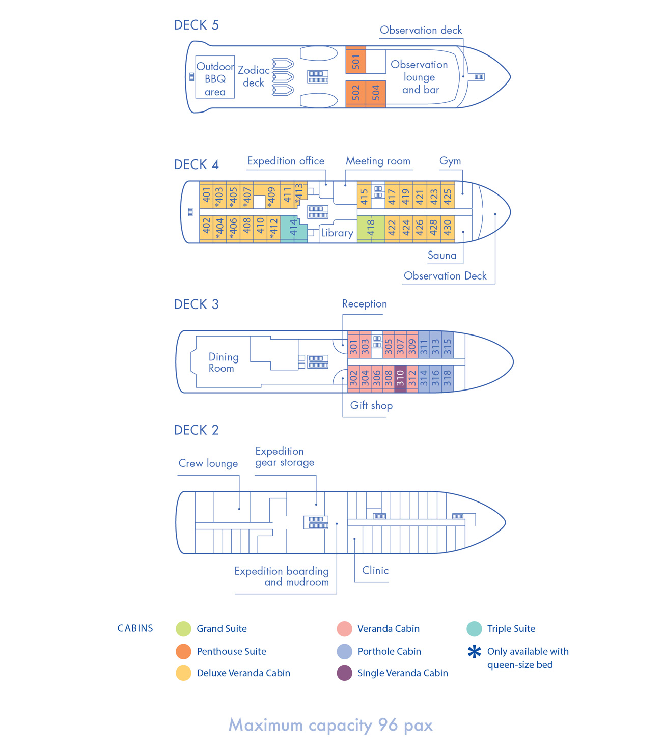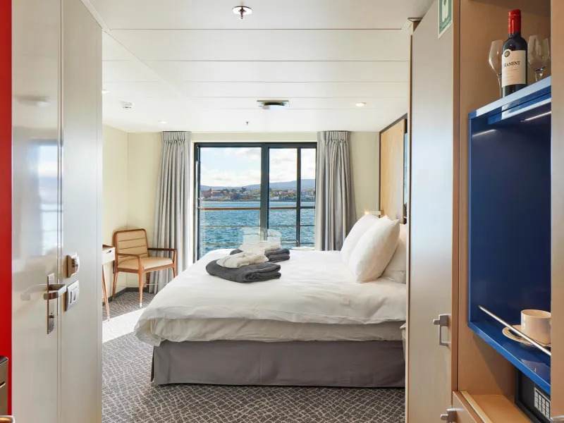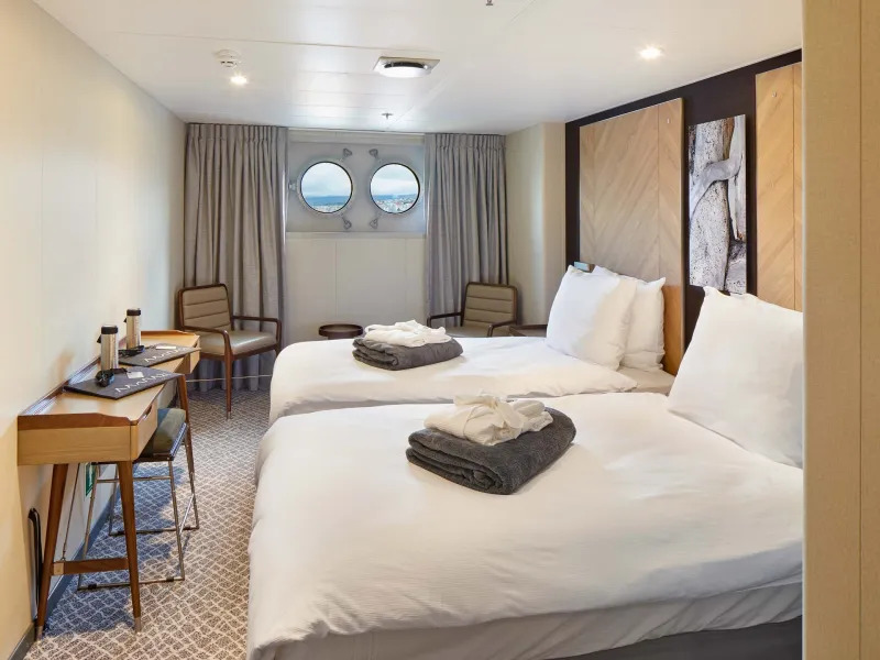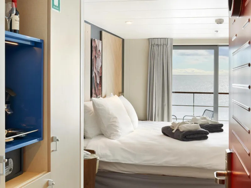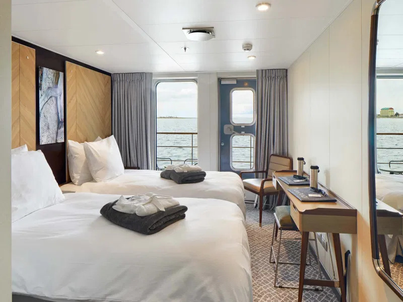 Das Schiff verfügt über 50 Passagierkabinen in fünf verschieden Kategorien. Die Kabinen sind sehr geräumig und reichen von 40 qm bis 20 qm. Alle Doppelkabinen haben zwei Einzelbetten, die als Queen-Size-Bett konfiguriert werden können und somit eine große Flexibilität für die Gäste bieten. 42 Kabinen verfügen darüber hinaus über ein großes Fenster und einen privaten Balkon. 8 Kabinen haben ein Bullauge. 16 angrenzende Kabinen können außerdem zu 8 Doppel-Suiten konfiguriert werden, um den Gästen die geräumigsten Unterkünfte zu bieten. Alle Kabinen verfügen über ein eigenes Bad und eine Sitzecke.