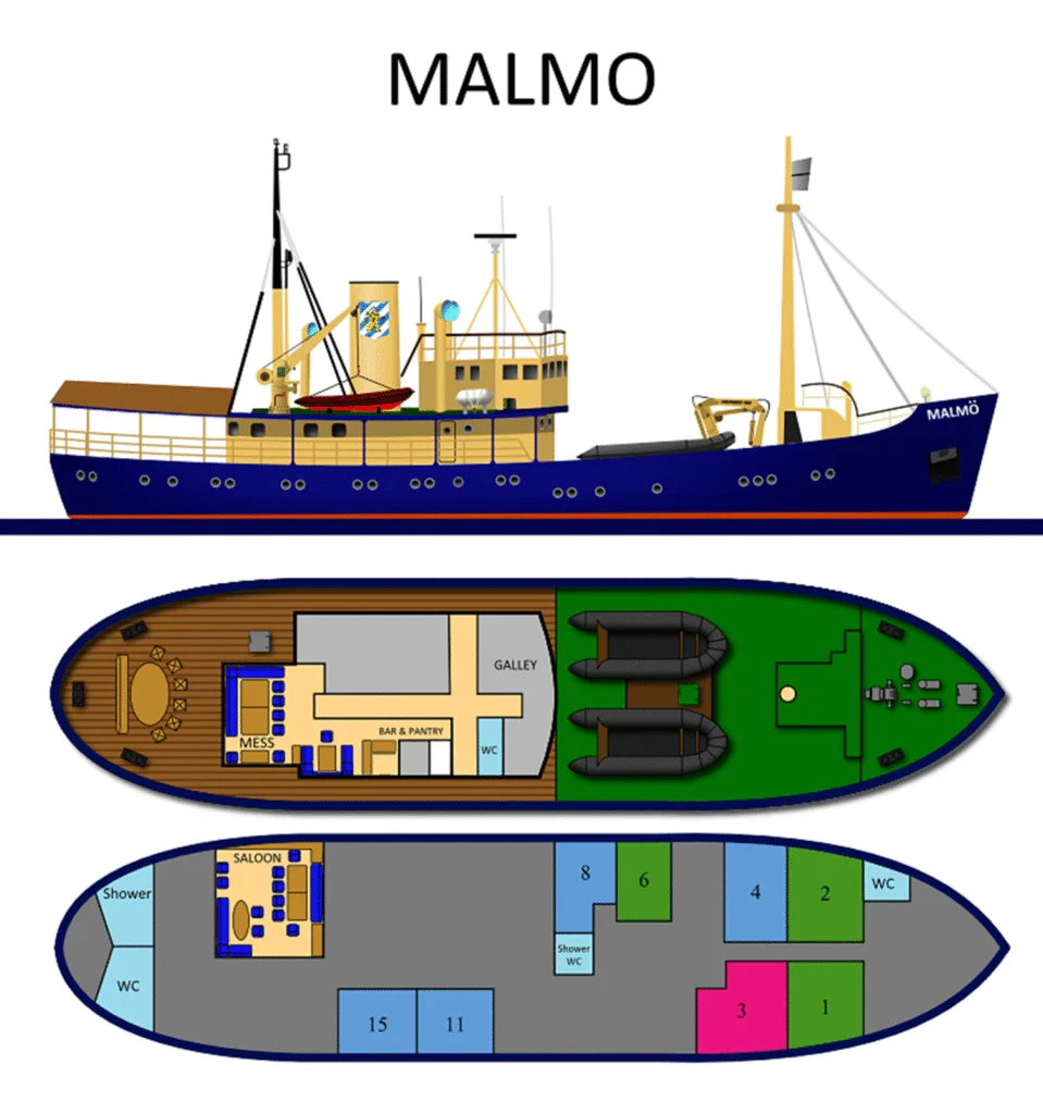 Die große Stärke der Malmö ist ihre Größe: mit nur 12 Passagieren sind sehr individuelle Touren möglich, abseits der Routen großer Schiffe und wesentlich flexibler bei allen Tier- und Naturbeobachtungen. Die Atmosphäre ist generell sehr familiär und informell.