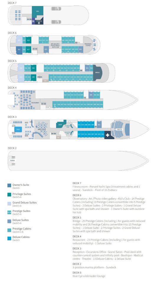 Das neuen Expeditions-Schiffe von Ponant Cruises garantieren einen besonders komfortablen Aufenthalt an Bord. Mit einer Länge von etwa 130 Metern bieten sie genügend Platz für zahlreiche Kabinen unterschiedlicher Preisklasse und einen großen öffentlichen Bereich. Ein ganz besonderes Highlight der Schiffe ist die sogenannte Blue Eye Lounge. Dort kann die Unterwasserwelt unmittelbar erlebt werden. Nur eine Glasscheibe trennt die Passagiere nun noch von der Artenvielfalt des Meeres. Einmalige Ausblicke können dort genossen und besonders eindrucksvolle Fotos geschossen werden.