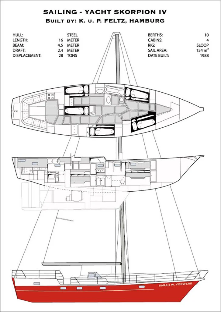 Die SARAH W. VORWERK ist eine 16 Meter lange Stahlyacht, die im Jahre 1988 in der Hamburger Feltz Werft erbaut wurde. Mit ihrem erfahrenen Skipper hat sie schon etliche erfolgreiche Törns in den Gewässern um Kap Hoorn, Süd Georgien und der Antarktis im Expeditionsstil erleben dürfen.