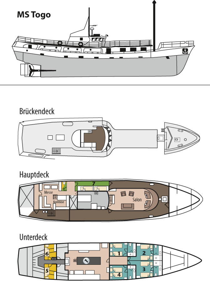 Die MS Togo verfügt über insgesamt sieben kleine, aber zweckmäßig und gemütlich eingerichtete Kabinen. Die vier 2-Bett Kabinen auf dem Unterdeck (Kabine Nr. 4 mit Doppelbett) verfügen über ein eigenes Bad mit Dusche und WC. Die 2-Bett-Kabine Nr. 7 auf dem Hauptdeck hat Bullaugen (Deckenhöhe 1,75 Meter) und teilen sich das Bad mit Dusche und WC mit den zwei Einzelkabinen. Die Einzelkabinen sind nur über eine steile Stiege zu erreichen. Alle Kabinen auf dem Unterdeck haben keine Fenster bzw. Bullaugen. In den Kabinen ist für große starre Koffen wenig Platz, Reisetaschen sind hier von Vorteil.